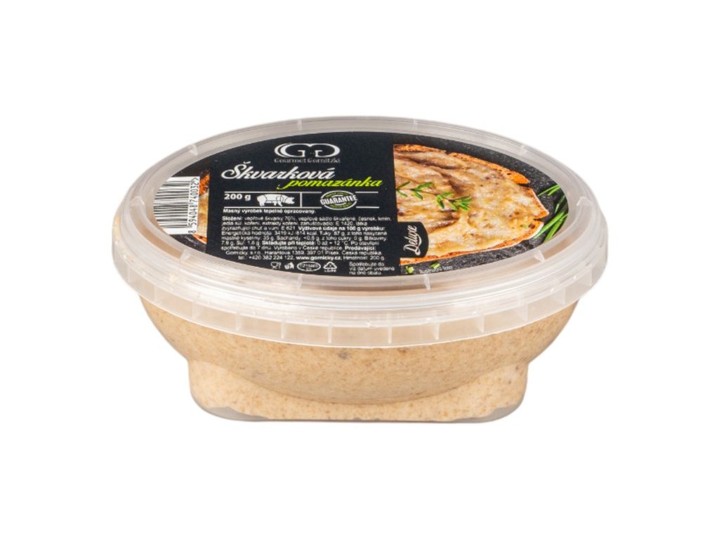 ⇢ složení: vepřové škvarky 70%, vepřové sádlo škvařené, česnek, kmín, jedlá sůl, koření, extrakty koření, zahušťovadlo: E 1420, látka zvýrazňující chuť a vůni: E621